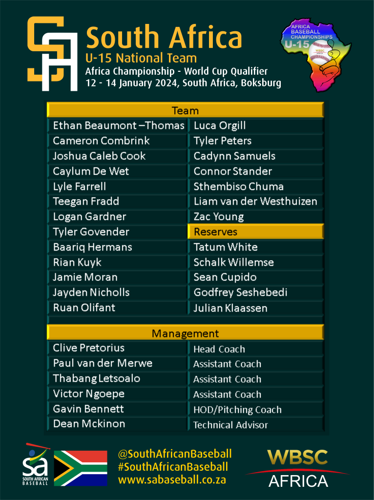 South African Baseball today proudly announced the National U15 team set to compete in the upcoming World Cup Africa U15 Qualifier to be held in South Africa at the Boksburg Cardinals Baseball Club from 12 – 14 January 2024.